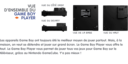 Des tonnes de jeux ! Le Game Boy Player joue plus de 1200 jeux du Game Boy original, du Game Boy Color et du Game Boy Advance. Retrouvez vos vieux favoris ou voyez des jeux comme ceux de la série de Castlevania trouver une toute nouvelle vie sur le grand écran. Maintenant, vous pouvez voir toutes ces merveilleuses images et entendre les bandes sonores étonnantes sur votre super télé, à la maison. On insère les logiciels dans la fente située à l'avant du Game Boy Player. Et n'oubliez pas vos jeux pour Nintendo GameCube pour autant ! Rien de plus facile que de passer de l'un à l'autre !